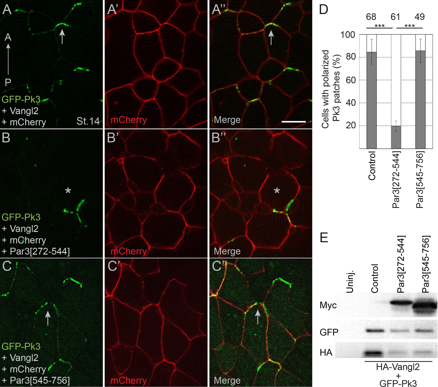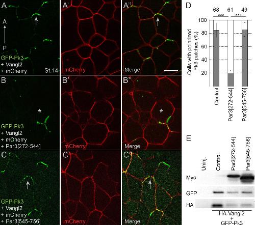 Figure 5 Pk3-interacting fragment of Par3 interferes with neural plate PCP. Two dorsal blastomeres of 16 cell embryos were injected with RNAs encoding GFP-Pk3 (100 pg), HA-Vangl2 (25 pg) and mCherry (70 pg) without (AâAâ) or with Par3[272-544] (0.5 ng) (BâBââ) or Par3[545-756] (0.5 ng) (CâCââ). Cells from embryos at stage 14 (St.14) with anteriorly polarized (arrows) and mislocalized (asterisks) GFP-Pk3 patches are shown. Anteroposterior (AP) axis of the neural plate is indicated. Scale bar, 20 µm. (D) Quantification of data in (AâC) shown as mean frequencies ± s. d. of polarized GFP-Pk3 patches in neuroepithelial cells. Total numbers of scored cells are shown above each bar; 5 to 25 cells were scored per embryo with five embryos taken for each experimental condition, statistical significance was determined by two-tailed Studentâs t-test, p<0.001. Data are representative of two experiments. (E) Protein expression levels were assessed in stage 14 embryos by immunoblotting with anti-Myc, anti-GFP and anti-HA antibodies. Control, embryos injected with HA-Vangl2 and GFP-Pk3 RNAs without Par3 constructs, Uninj., uninjected embryos. |