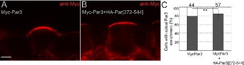 Figure 5âfigure supplement 2. Par3[272-544] construct does not affect Par3 localization.(AâC) Four animal blastomeres of 16 cell embryos were injected with Myc-Par3 RNA, 70 pg with or without 0.5 ng of HA-Par3[272-544] RNA. Injected embryos were cultured until stage 11, cryosectioned and immunostained for Myc (A, B). (A, B) Myc-Par3 with is enriched at the apical membrane. Scale bar, 10 µm. (C) Quantification of data in (A, C) shown as mean frequencies ± s. d. of superficial ectoderm cells with apically enriched Myc-Par3. Total numbers of scored cells are shown above each bar; 13 to 26 cells were scored per embryo with three embryos taken for each experimental condition, statistical difference determined by two-tailed Studentâs t-test was not significant, p>0.05. Data are representative of two experiments. |