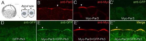 Figure 6. Par3 recruits Pk3 to the apical side of the cell in vivo.Embryos were injected with GFP-Pk3 and Myc-Par3 RNAs (100 pg each), cryosectioned at stage 10.5 and immunostained with indicated antibodies (A) Scheme showing a relative position of imaged superficial ectoderm cells. Both endogenous Par3 (B), and exogenous Myc-Par3 (C, Eâ, Eââ) are apically localized. (Câ) Lack of Myc-Par3 staining with anti-GFP antibody. (D) Lack of apical enrichment of exogenous GFP-Pk3. (EâEââ) Myc-Par3 recruits GFP-Pk3 to the apical surface. (B, C, E) Apical enrichment is shown by arrowheads. The apical recruitment of Pk3 was observed in > 90% of cells coinjected with Pk3 and Par3. Each group contained five embryos. The same results were obtained in five independent experiments. Scale bar 10 µm.Figure 6âfigure supplement 1. Par3 recruits Pk3 but not Dvl2 to the apical cell membrane.8â16 cell Xenopus embryos were injected animally with 100 pg of the RNAs encoding GFP-Pk3 (Pk3), HA-RFP-Pk3, GFP-Dvl2, Myc-Par3 and Myc-Par1T560A as indicated, cultured until stage 10.5, cryosectioned and immunostained for GFP (A, B, EâG), HA (C, D) or Myc (H). Myc-Par3 recruits GFP-Pk3 (A, B), but not GFP-Dvl2 (E, F), to the apical membrane. (C, D) Myc-Par3 promotes the apical localization of HA-RFP-Pk3. (G) Myc-Par1T560A does not promote GFP-Pk3 apical localization. (H) Myc-Par1T560A is cortically localized. Scale bar, 10 µm. The apical recruitment of Pk3 was observed in the majority (>90%, n > 100) of cells co-expressing Pk3 and Par3, but not in cells expressing Pk3 alone. |