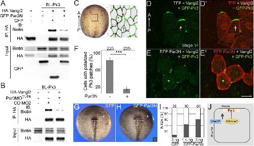 Figure 7 Par3 is required for the interaction of Pk3 and Vangl2 in vivo. (A, B) Decrease of Vangl2 biotinylation by BL-Pk3 (see Figure 3) in embryos injected with Par3MO or Par3N RNA. Embryos were coinjected into animal blastomeres with biotin and RNAs encoding BL-Pk3, 0.1 ng, and HA-Vangl2, 50 pg, GFP, 1 ng, GFP-Par3N, 1 ng (A), or MOs (CO MO2 or Par3MO5âUTR, 10 ng each, (B) as indicated. Biotinylated HA-Vangl2 was detected with anti-biotin antibodies in pulldowns with anti-HA antibodies. (A, B). Protein expression levels in stage 13 embryos were assessed by immunoblotting of lysates with anti-HA, anti-GFP and anti-biotin (for FLAG-BL-Pk3 protein) antibodies (A, B). (CâI) Par3N disrupts neuroepithelial PCP. (CâE) Two dorsal blastomeres of 16 cell embryos were injected with GFP-Pk3 RNA, 100 pg, HA-Vangl2 RNA, 25 pg, and Turbo FP635 (TFP) RNA, 0.1 ng, or RFP-Par3N RNA, 0.4 ng. Injected embryos were cultured until stage 14, fixed and the neural plate explants were imaged. (C) En face view of a neurula embryo. Polarized cells from the boxed area used for imaging are shown schematically on the right. Anterior PCP complexes are in green (arrows), the anterior-posterior (AP) axis is indicated. (DâEâ) Representative images. (D, Dâ) Anterior enrichment of Pk3/Vangl2 complexes (arrows) in a control embryo. (E, Eâ) Lack of PCP (asterisks) in a Par3N-expressing embryo. Scale bar, 20 µm. (F) Frequencies of neuroepithelial cells containing polarized Pk3 cortical patches. Means ± s. d. are shown for three independent experiments. Total numbers of scored cells are above each bar. Significance was determined by the two-tailed Studentâs t-test, p<0.001 (asterisks). (GâI) Neural tube defects in representative stage 17/18 embryos unilaterally injected with GFP RNA (3 ng, (G) or GFP-Par3N RNA (3 ng, (H). Asterisk indicates the injected side. Note the difference in the distance between the neural fold and the midline (white line) at the injected side as compared to the uninjected side. (I) Frequencies of neural tube defects shown in G, H. Numbers of embryos from two experiments are shown above each bar. (J) Working model: Par3 recruits Pk3 to the apical surface to promote the interaction of Pk3 and Vangl2 at the apical junctions that is necessary for planar polarization. |