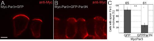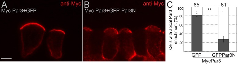 Figure 7âfigure supplement 1 Par3N inhibits the apical localization of Par3. (AâC) Four animal blastomeres of 16 cell embryos were injected with 70 pg of Myc-Par3 RNA and 0.8 ng of GFP or GFP-Par3N RNAs. Injected embryos were cultured until stage 11, cryosectioned and immunostained for Myc (A, B). (A) Myc-Par3 co-expressed with GFP is enriched at the apical membrane. (B) This apical enrichment of Myc-Par3 is reduced by coinjection of GFP-Par3N RNA. Scale bar, 10 µm. (C) Data in (A, C) are shown as mean frequencies (±s. (d).) of superficial ectoderm cells with apically enriched Myc-Par3. Total numbers of scored cells are shown above each bar; 4 to 15 cells were scored per embryo with six embryos in each experimental group. Statistical significance was determined by two-tailed Studentâs t-test, p<0.01. Data are representative of two experiments. |
