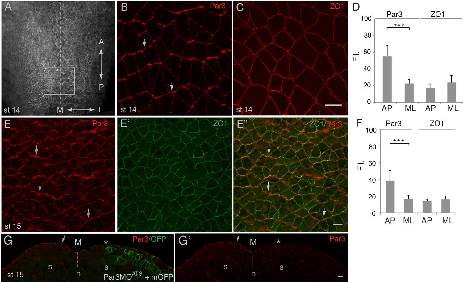 Figure 1. Planar polarization of Par3 in the Xenopus neural plate. (AâC, E) Representative images show en face view of immunostained neural plate explants prepared from fixed Xenopus embryos at stages (st) 14â15. (A) Neural plate explant with the approximate position of the imaged area (BâE) (boxed). Dashed line indicates the neural midline (M). The anteroposterior (AP) and the mediolateral (ML) axes are shown. (B) Par3 is enriched at AP, horizontal, cell borders (arrows) as compared to ML, vertical, cell borders. (C) ZO1 is equally distributed to all junctions. (D, F) Fluorescence intensity (F.I.). Means ± s. d. represent three different experiments. At least 30 cells from three to four different embryos were analyzed per group. Significance was determined by the two-tailed Studentâs t-test, p<0.001. (EâEâ) Double staining with Par3 and ZO1-specific antibodies reveals planar polarization of Par3 but not ZO1 along the AP axis. (G, Gâ) Validation of the Par3 antibody. Cross-section of a neurula embryo, stage 15, unilaterally injected with Par3MOATG (20 ng, asterisk) and GFP-CAAX, membrane GFP (mGFP) RNA (100 pg) as lineage tracer. Arrow points to apical Par3 at the uninjected side, whereas the neural plate is flat on the injected side; n, notochord; s, somite, M, midline (dashed line). Control MO did not alter Par3 distribution (see Figure 2âfigure supplement 3). Scale bars are 20 µm. |