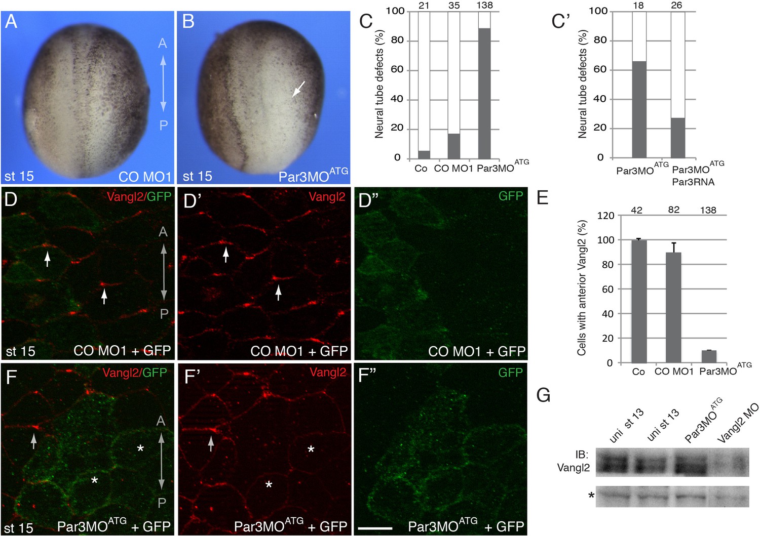 Figure 2. A requirement for Par3 in neural plate PCP and neural tube closure.(AâF), Eight-cell embryos were unilaterally injected into two animal blastomeres with control morpholino 1 (CO MO1), 20 ng, or Par3MOATG, 20 ng, as indicated, with GFP RNA, 0.1 ng, as a lineage tracer. Dorsal view is shown, and the anteroposterior (AP) axis of the neural plate and embryonic stage 15 (st 15) are indicated. (AâC) Par3 depletion results in neural tube defects. Arrow points to the open neural fold. (C) Frequencies of neural tube defects were scored by the lack of neural fold formation. Numbers of scored embryos per group are shown above each bar. (Câ) Partial rescue of the defect with Par3 RNA, 0.2 ng, is shown. Data are from three different experiments. (DâF), Embryos were injected as described above. Neural plate cells mosaically depleted of Par3 (labeled by GFP) lack Vangl2 enrichment at the anterior border of each cell (asterisks) as compared to control GFP-negative cells (arrows). D', D'', F', F'' are single-channel images corresponding to D and F. CO MO1 injection had no effect on the anterior distribution of Vangl2. Scale bar, 20 µm. (E) Quantification of data from the experiments with Par3MOATG showing mean frequencies ± s. d. of cells with anterior Vangl2. At least 5â10 embryos were examined per each treatment. Numbers of scored cells are shown on top of each bar. Co, uninjected control. (G) Immunoblot analysis of Vangl2 in embryo extracts. Xenopus embryos were injected with the indicated MOs into animal pole blastomeres at the two-cell stage and collected at stage 13 for immunoblotting (IB) with Vangl2 antibodies. Asterisk marks a non-specific band indicating loading. Uni, uninjected.Figure 2âfigure supplement 1. Depletion of Par3 with Par3MO5âUTR causes neural tube closure defects.(A) Four-to eight-cell embryos were injected with Control MO2 (CO MO2) and Par3MO5âUTR into each of the animal blastomeres (10 ng per blastomere). Ectoderm explants (animal caps) were prepared from the injected embryos at midblastula stages. The explants were lysed at the equivalent of stage 14 for immunobloting with anti-Par3 and anti-β-catenin antibodies. The decrease in the intensity of two bands is observed in Par3MO5âUTR but not CO MO2 injected explants (arrowheads); β-catenin is a control for loading. Band intensity ratios of the highest molecular weight Par3 isoform to β-catenin are shown. This ratio is set to one in uninjected explants. (B) Eight-cell embryos were unilaterally injected into two animal blastomeres with CO MO2, 20 ng, or Par3MO5âUTR, 20 ng, as indicated. Dorsal view is shown, and the anteroposterior (AP) axis of the neural plate is indicated. (B, C) Par3 depletion results in neural tube defects. Arrow points to the open neural fold, asterisk indicates the injected side. (C) Frequencies of neural tube defects were scored by the lack of neural fold formation at the injected side. Numbers of scored embryos per group are shown above each bar. Data are representative of two experiments. |