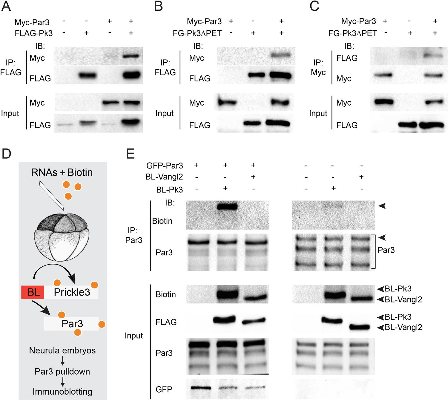 Figure 3 Par3 interacts with Pk3 in HEK293T cells and Xenopus embryos. (A–C) Physical interaction of Par3 and Pk3 in transfected HEK293T cells. Myc-Par3 is pulled down from cell lysates with FLAG-Pk3 (A) or FLAG-GFP(FG)-Pk3∆PET (B). FG-Pk3∆PET is pulled down with Myc-Par3 (C). (D, E) Interaction of Par3 and Pk3 in Xenopus embryos assessed by proximity biotinylation. (D) Experimental scheme. Biotin and RNAs encoding FLAG-Biotin Ligase (BL)-Pk3 or FLAG-BL-Vangl2, 0.5 ng each, with or without GFP-Par3 RNA, 0.1 ng, were injected into the animal region of four- to eight- cell embryos. Injected embryos were lysed at stages 12.5–13 for immunodetection of biotinylated proteins. (E) Exogenous (left) and endogenous (right) Par3 is biotinylated by BL-Pk3 but not BL-Vangl2. Three bands that correspond to endogenous Par3 isoforms (bracket) are pulled down and detected by anti-Par3 antibodies, however only the top band corresponds to exogenous GFP-Par3 (arrowheads). Protein levels are shown by immunoblotting with anti-Myc and anti-FLAG antibodies in (A–C) and anti-biotin, anti-Par3, anti-FLAG and anti-GFP antibodies |