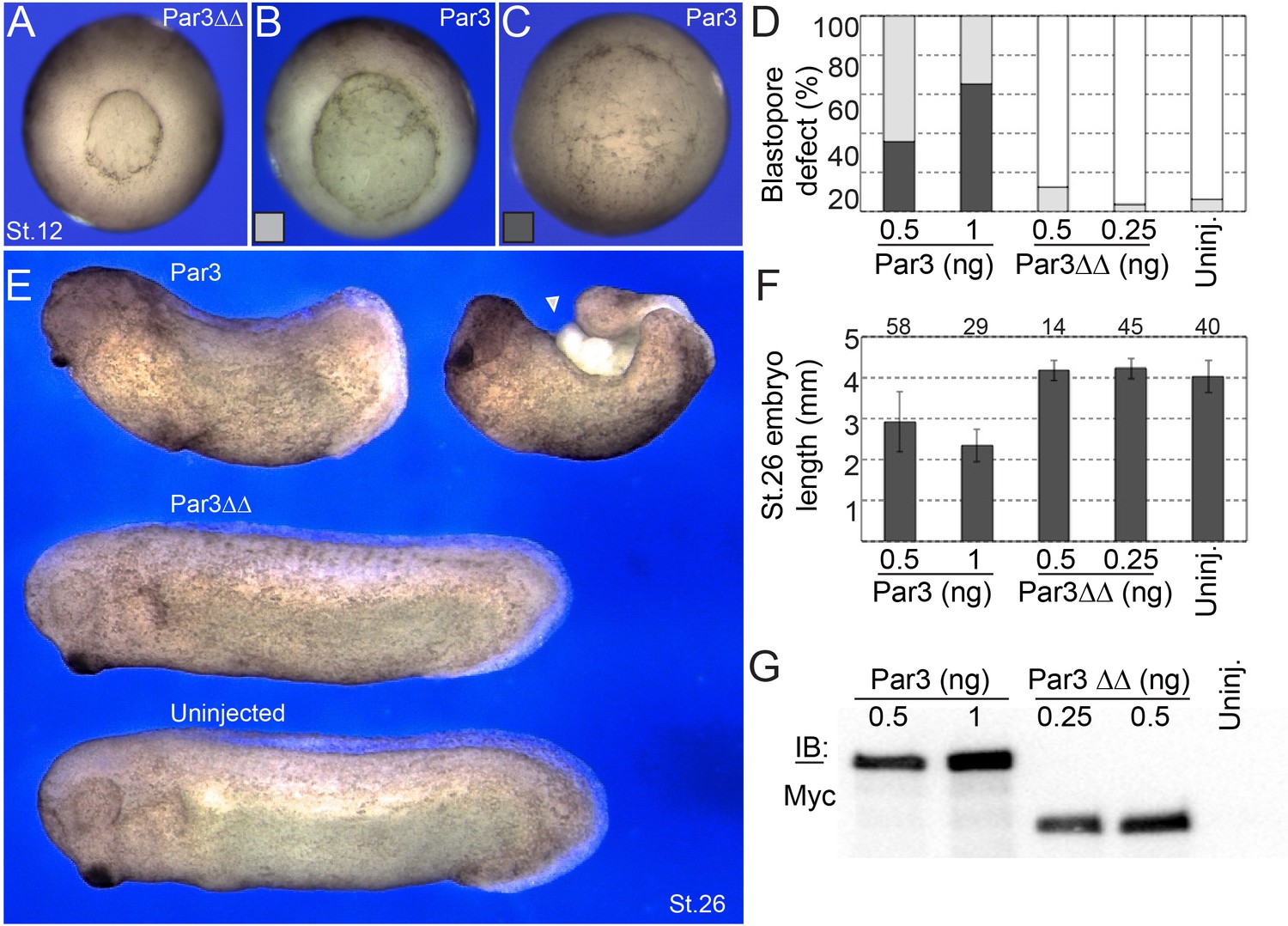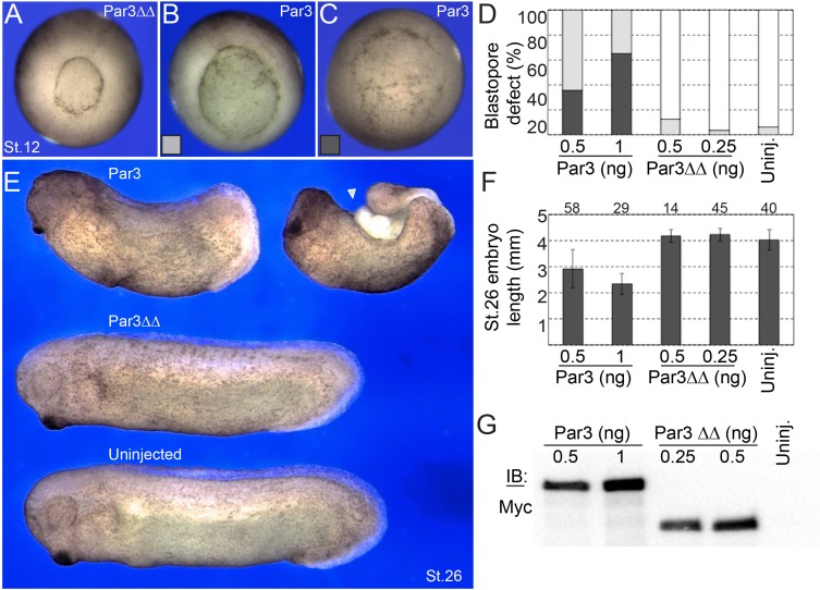 Figure 5âfigure supplement 3. The ability of Par3 to inhibit blastopore closure and body axis elongation is lost upon the disruption of Pk3 binding.Four-cell stage embryos were injected with Par3 constructs into the marginal zone of two dorsal blastomeres. (AâC) Vegetal views of stage 12 (St. 12) embryos injected with Par3ââ RNA (A, 0.5 ng), and wild type Par3 RNA (B, C, 0.5 ng). (D) Frequencies of mild (B) and severe (C) blastopore defects. (E) Representative images of stage 26 (St. 26) embryos injected with Par3 (0.5 ng) and Par3ââ (0.5 ng) RNAs. Par3-expressing embryos were shortened (top left) and often exhibited protruding endoderm due to incomplete blastopore closure (arrowhead). By contrast, Par3ââ-injected embryos were similar to uninjected embryos. (F) Average length of embryos ± s. d. is shown. (G) Comparison of Par3 protein levels in injected stage 12 embryos by immunoblotting with anti-Myc antibodies. Each sample has been pooled from five embryos. Each lane was loaded with lysate amount equivalent to half-embryo. |