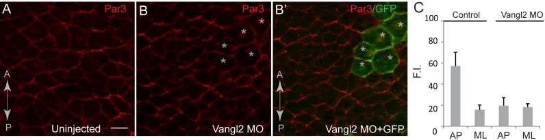 Figure 2âfigure supplement 4 Planar polarity of Par3 is lost in Vangl2-depleted cells in the neural plate. (A, B) En face view of immunostained neural plate explants from fixed Xenopus embryos at stages 15/16. The anteroposterior (AP) axis is shown. (A) Par3 is enriched at the anteroposterior cell borders in untreated cells. (B, Bâ) Polarization of Par3 at the anteroposterior cell borders is no longer detected in Vangl2 MO injected cells (asterisks). (C) Results are shown as means ± s. d., with each group containing ten embryos. At least 15 cells from two embryos were analyzed per group. F.I., Fluorescence intensity. The experiment was repeated two times. Scale bar, 20 µm. |