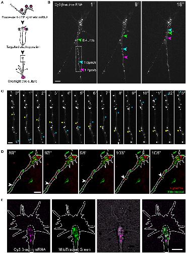 Figure 7. Endogenous RNA worms in vitro. (A–E) Endogenous RNA was labeled by fluorescent-UTP. Elongated RNA species, which we termed “RNA worms,” were sporadically observed during live imaging. (A,B) An RNA worm showing anterograde movement in the axon shaft (A) and more subtle twisting-turning dynamics in the distal axon/growth cone (B). (C,D) RNA worms are not labeled by MitoTracker, as shown in both axon shaft (C) and growth cone (D). (E) RNA worms are not labeled by ER-Tracker. Scale bars, 10 μm for (A,B) and 5 μm for (C–E). See also Figures S3–5. |
