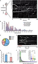 Figure 2. Dynamics of β-actin mRNA granules in axons. (A) An example of kymographs generated along axon shaft for kinetics analysis. (B) Population distribution of β-actin mRNA granule speeds for anterograde- and retrograde-moving granules in axon and growth cone. β-actin mRNA granule speeds showed biphasic distribution. One peak consisted of stationary and slow diffusive motion with speed < 0.5 μm/s. The more motile population showed a bell-shaped distribution. High speed (>2 μm/s) was observed for anterograde-moving granules along the axon shaft. (C) Proportion of anterograde-moving, retrograde-moving, and stationary β-actin mRNA granules in axons (n = 562 granules). (D) Anterograde-moving granules showed higher average speed than retrograde-moving granules. Nocodazole treatment greatly reduced kymographic tracks of fast-moving mRNA granules within 30 min, leaving mainly horizontal tracks from stationary mRNA granules. (F) Average instantaneous speed of all β-actin mRNA granules obtained from automated tracking is presented. The speed reduced to below 0.15 μm/sec upon 35-min nocodazole (Noco) treatment, but was unchanged upon 20-min cytochalasin D (CytoD) treatment. [F(2, 3643) = 146, p < 0.0001]. Error bars represent SEM. *p < 0.05, ***p < 0.001 (one-way ANOVA with Tukey multiple comparisons test for F). |