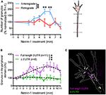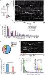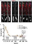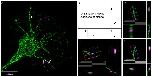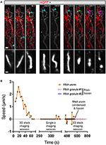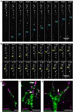 Figure 8. Endogenous RNA worms in vivo. (A) Endogenous RNA was labeled by fluorescent-UTP and the RGC axons were labeled by mGFP for visualization in vivo. The example shows the anterograde movement of the RNA worm toward the growth cone, followed by instantaneous condensation and fission into at least two separate RNA granules with globular morphologies. (B) Quantification of the speed of the RNA worm movement for (A). Scale bars, 5 μm for upper panel and 1 μm for lower panel of (A). |