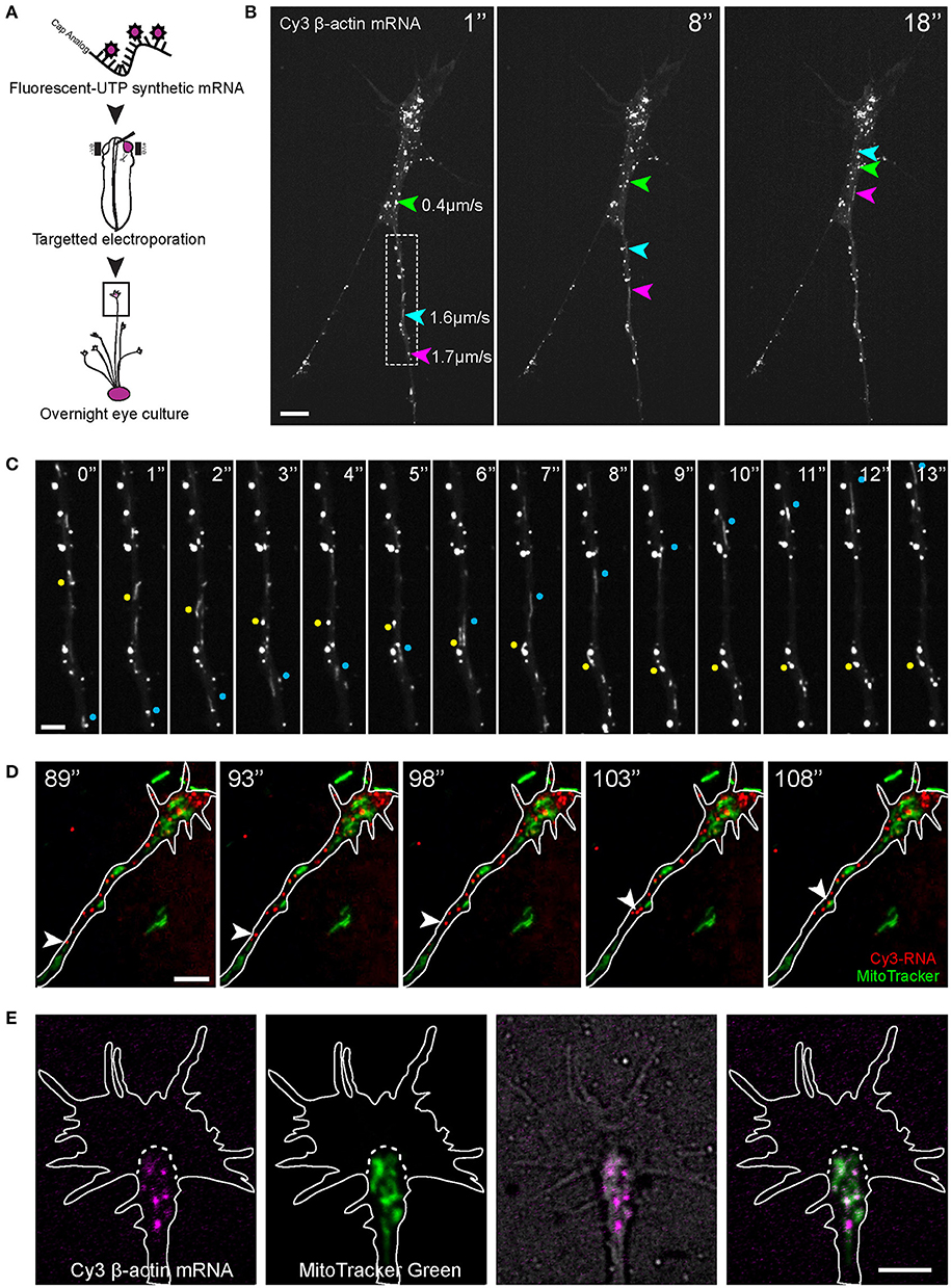 Figure 1. Visualization of β-actin mRNA trafficking in axons. (A) Fluorescent β-actin mRNA was electroporated into stage 24–27 Xenopus embryo eye primordia. The electroporated eye primordia were dissected and cultured for live imaging. (B,C) The synthetic β-actin mRNA was observed as fluorescent granules in cultured RGC axons and growth cones. (B) Live imaging of β-actin mRNA granules revealed different modes of motion and a broad range of speed (arrows and arrowhead). (C) Both anterograde (blue dots) and retrograde (yellow dots) movements were present. (D) OMX imaging of endogenous RNA labeled globally with Cy3-UTP (Cy3-RNA) and mitochondria. (E) Within the growth cone the β-actin mRNA granules tended to concentrate in the organelle-rich central domain, as indicated by MitoTracker Green. Scale bars, 5 μm for (B,D,E) and 2 μm for (C). See also Figure S1. |