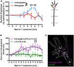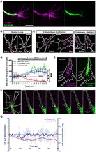 Figure 4. Netrin-1 gradient induces asymmetric localization of β-actin mRNA in growth cone. (A) Growth cones were imaged at 1 frame per second in the presence a netrin-1 gradient set up from a micropipette perpendicular to the growth cone. (B) The mean x-coordinate of all β-actin mRNA granules at each timepoint was compared to the mean x-coordinate at time 0. With the source of netrin-1 on the left, a negative shift value indicates a shift of β -actin mRNA granules toward the netrin-1 source. (C) Relative granule centroid shift values are plotted. (n = 15 growth cones for full length 3′UTR at 1fps for 5–15 min; n = 9 growth cones for Δ3′UTR at 1fps for 5–15 min) Black dotted lines represent least-square fits to a linear function. [F(1, 407) = 98.27, ***p < 0.0001; extra sum-of-squares F test] (D) The distribution of full-length β-actin mRNA granules are binned and show a rapid shift toward the source of netrin-1. The bar chart shows the averages from 3 growth cones. (E) β-actin mRNA with truncated 3′UTR did not show asymmetric distribution toward netrin-1 gradient. The bar chart shows the averages from 6 growth cones. (F) Time lapse images showing a prominent shift of full-length β-actin mRNA toward the source of netrin gradient (toward the left as denoted by green arrows; midline is denoted by dashed red line. (F; far right) Photobleaching-corrected, denoised time lapses images were stacked and maximally projected. The temporal-color coded image reveals the full-length β-actin mRNA shift toward netrin gradient is both asymmetrical and fast. Scale bars, 5 μm. Error bars represent SEM. |