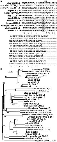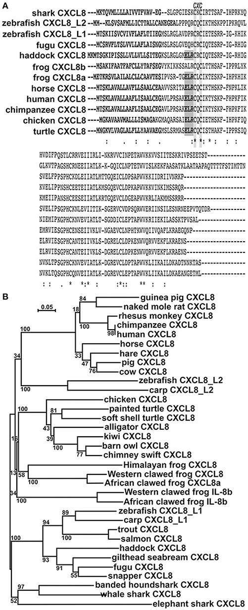 Figure 1. In silico analyses of CXCL8 phylogeny and protein sequence conservation.(A) The protein alignment was performed using ClustalW2 server. Fully conserved residues are indicated by an asterisk (*), partially conserved and semi-conserved substitutions are represented by â:â and â.â, respectively. Putative signal peptides are bolded, the ELR motif is boxed in gray and the conserved CXC motif is highlighted. (B) The phylogenetic tree was constructed using the neighbor joining method and bootstrapped 10,000 times (denoted as %s). The accession numbers for the respective protein sequences are: guinea pig CXCL8: NP_001166870.1; naked mole rat CXCL8: XP_004833980; rhesus monkey CXCL8: NP_001028137.1; chimpanzee CXCL8: NP_000575.1; human CXCL8: NP_000575.1; horse CXCL8: NP_001077420.2; hare CXCL8: ALG04568.1; pig CXCL8: NP_999032.1; cow CXCL8: NP_776350.1; zebrafish CXCL8_L2: XP_009305130.1; carp CXCL8_L2: XP_018936341.1; chicken CXCL8: NP_990349.1; painted turtle CXCL8: XP_005304195.1; soft shelled turtle CXCL8: ACP28489.1; alligator CXCL8: XP_006018817.1; kiwi CXCL8: XP_013807042.1; barn owl CXCL8: XP_009963343.1; chimney swift CXCL8: XP_010001929.1; Himalayan frog CXCL8: XP_018421489.1; Western clawed frog CXCL8a: XP_002942578.2; African clawed frog CXCL8a: OCU00045.1; Western clawed frog CXCL8b: XP_002942578.2; African clawed frog CXCL8b: NP_0010912223.1; zebrafish CXCL8_L1: XP_001342606.2; carp CXCL8_L1: XP_016375461; trout CXCL8: XP_020330727.1; salmon CXCL8: NP_001134182.1; haddock CXCL8: CAD97422.2; gilthead seabream CXCL8: AGS55343.1; fugu CXCL8: NP_001027759.1; snapper CXCL8: AGV99968.1; banded houndshark CXCL8: BAB79448.1; whale shark CXCL8: XP_020370926.1; elephant shark CXCL8: NP_001279539.1.