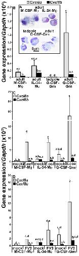 Figure 6. Analysis of immune gene expression and cytology of rCXCL8a- and rCXCL8b-elicited tadpole cells. Tadpoles and adult frogs were injected intraperitoneally with rCXCL8a or rCXCL8b (1 μg/g of body weight) in 10 μl of saline or with an equal volume of the vector control (supernatants from empty vector-transfected Sf9II cell, processed in parallel to rCXCL8a and rCXCL8b production). After 4 h, animals were lavaged with saline and the cells were enumerated (A). The tadpole (B,C) and adult frog (not presented) rCXCL8a and rCXCL8b-elicited cell immune gene expression was examined relative to the Gapdh control (N = 6). All results are presented as means + SEM. Above-head letters denote statistical designations: experimental groups described by distinct letters are statistically different (P < 0.05) while those marked by the same letters are not. (D) Tadpole rCXCL8a and rCXCL8b-elicited cells were stained with a rabbit anti-frog rG-CSFR (or saline) Ab and secondary goat anti-rabbit Ab and examined by confocal microscopy.