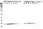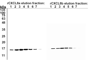 Supplemental Figure 1. Western blot of the produced, purified, and eluted rCXCL8a and rCXCL8b fractions. The eluted recombinant (r)CXCL8a and rCXCL8b were resolved by SDS PAGE, transferred onto nitrocellulose membranes and western blots were performed using an HRP-conjugated mouse anti-V5 (Sigma) to determine which elution fractions contained rCXCL8a (15 kDa) and rCXCL8b (16 kDa).