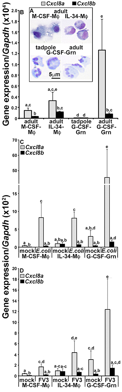 Figure 3. Analyses of CXCL8a and CXCL8b gene expression in frog macrophages and granulocytes. (A) Cytology of tadpole rG-CSF-elicited peritoneal granulocytes (G-CSF-Grn) and adult frog bone marrow-derived macrophages, differentiated with rM-CSF (M-CSF-MÏ) or rIL-34-MÏs (L-34-MÏ) and granulocytes (Grn), differentiated with rG-CSF (G-CSF-Grn). (B) The adult frog M-CSF-MÏ, IL-34-MÏ, and G-CSF-Grn were examined for their steady state gene expression of Cxcl8a and Cxcl8b. (C) The adult frog M-CSF-MÏ, IL-34-MÏ, and G-CSF-Grn were either mock infected (saline) or challenged with FV3 at a multiplicity of infection of 0.5 PFU/cell. After 24 h of challenge, cells were examined for Cxcl8a and Cxcl8b gene expression relative to Gapdh (N = 5). (D) M-CSF-MÏ, IL-34-MÏ, and G-CSF-Gran were mock challenged (saline) or challenged with heat-killed E. coli for 24 h before Cxcl8a and Cxcl8b gene expression analysis, relative to Gapdh (N = 5). All results are presented as means + SEM. Above-head letters denote statistical designations: experimental groups described by distinct letters are statistically different (P < 0.05) while those marked by the same letters are not.