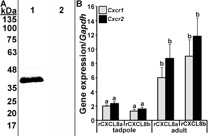 Supplemental Figure 2. Analyses of the anti-G-CSFR polyclonal antibody and the rCXCL8a- and rCXCL8b-elicited granulocyte expression of the Cxcr1 and Cxcr2 genes. (A) Rabbits were immunized with rG-CSFR and the resulting serum was applied to a HiTrap Proetin A HP column (GE Health) to isolate the IgG fraction, and to a rG-CSFR-bound Sulfo-Link Protein column to purify the IgG fraction that cross-reacted with the rG-CSFR. To confirm the specificity of this reagent, this anti-rG-CSFR IgG farction was used to perform a western blot of the rG-CSFR before (lane 1) or after (lane 2) pre-absorbing the Ab against the rG-CSFR. (B) Tadpoles and adult frogs were injected intraperitoneally with rCXCL8a or rCXCL8b (1 μg/g of body weight) in 10 μl of saline or with an equal volume of the vector control. After 4 h, animals were lavaged with saline and the cells were enumerated and examined for their expression of Cxcr1 and Cxcr2. Above-head letters denote statistical designations: experimental groups described by distinct letters are statistically different (P < 0.05) while those marked by the same letters are not.