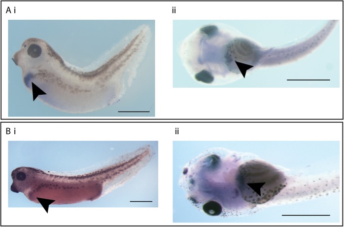 WISH assay for Alpha-1-Microgobulin/Bikunin Precursor (AMBP) (A) and miR-122 (B) at stage 38 (Ai and Bi) and stage 45 (Aii and Bii). The stage 38 embryos are shown in lateral view and the stage 45 embryos are shown ventrally. The specific purple WISH stain is indicated with an arrow. These embryos are representatives of the typical expression patterns seen (nâ=â10). Scale bar represents 1âmm.
