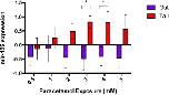 Stage 38 embryos were exposed to paracetamol (0-5âmM) and harvested at stage 45. The expression of miR-122 in the gut (purple) and tail (red) was measured using qRT-PCR (log (fold changeâ±âSEM)) and normalised to embryos exposed to Xenopus media only (0âmM). The statistically significant difference of miR-122 expression between tissues from embryos treated with the same paracetamol concentration was measured using the Mann-Whitney test (Pâ<â0.05) (nâ=â5).
