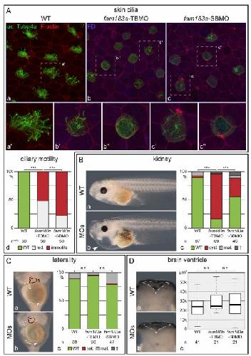 and hydrocephalus (D) were analyzed at stage 45. Note that epidermal cilia defects and cardial edemata, were