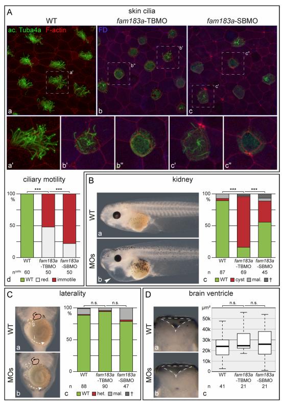 with fam183a-TBMO (b) or -SBMO (c), cultured to stage 33 and analysed for epidermal MCC ciliation
