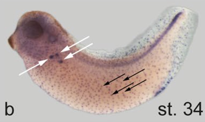 fam183b (family with sequence similarity 183, member B) gene expression in Xenopus laevis embryo, assayed via in situ hybridization, NF stage 34, lateral view, anteriorleft, dorsal up.