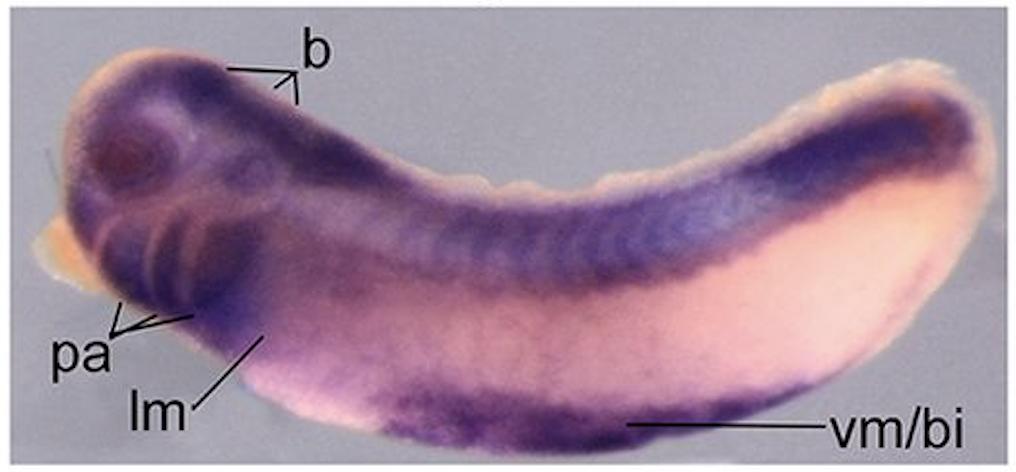 Fig. 1. rpsa is dynamically expressed in development. (A,B) Both in situ hybridization (A) and ultra-high temporal resolution RNA-seq analysis (B) reveal low levels of rpsa transcripts prior to stage 12 in X. tropicalis. Expression increases throughout subsequent stages and is primarily associated with the developing neural folds (nf), brain (b), cranial neural crest (cnc) and ventral mesoderm/blood islands (vm/bl). Expression is also diffusely detected in the lateral mesoderm (lm) where the spleen will form. pa, pharyngeal arches. |