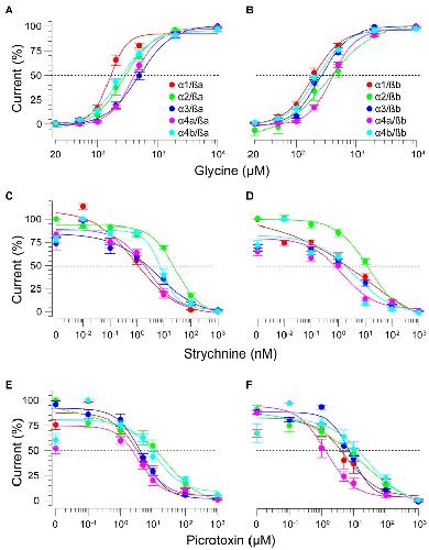 Figure 5. zGlyRß subunits form functional heteromeric receptors with zGlyRα subunits. Cumulative dose-response relationships of glycine-evoked currents from oocytes co-injected with 2.5 femtomoles of zGlyRα cRNA and 2.5 femtomoles of either zGlyRßa (A) or zGlyRßb (B) cRNA. Ten oocytes were used for each assay. (C–F) Cumulative dose-response relationships of strychnine and picrotoxin-blocked currents from heteromeric zGlyRs. Ten oocytes were used for each assay.