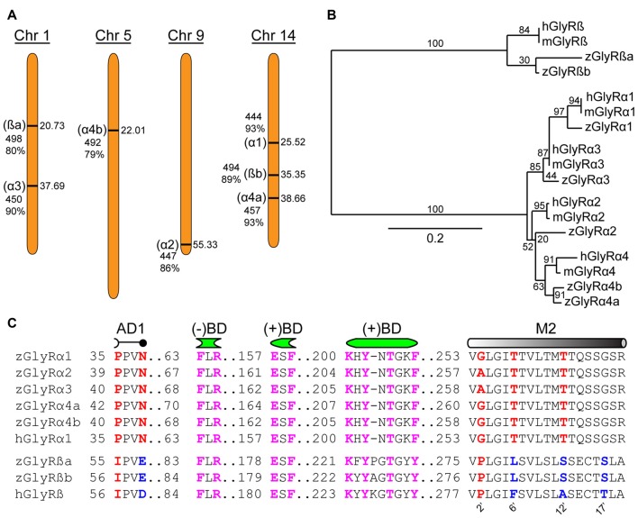 Figure 1. Zebrafish family of glycine receptors (GlyR). (A) Chromosomal (Chr) arrangement of zebrafish GlyR (zGlyR) subunits. Location (in Mbp) are on the right, while name of subunit, length and sequence similarity to human ortholog are given to the left. (B) Phylogenetic analysis of zGlyR subunits. Horizontal scale bar at the bottom reflects amount of genetic change, all other numbers are bootstraps. (mGlyR and hGlyR) mouse and human GlyR subunit. (C) Sequence alignments of zGlyRα subunits to hGlyRα1, and zGlyRà subunits to hGlyRÃ. Red letters indicate residues conserved among α and à subunits from zebrafish and human. Blue letters indicate residues conserved between zGlyRà paralogs which differ from hGlyRÃ. Magenta letters indicate residues conserved between α and à subunits from zebrafish and human. AD1: assembly domain one, (â)BD and (+)BD: negative and positive faces of the inter-subunit binding sites for glycine and strychnine, M2: transmembrane domain 2. Numbered residues (â) indicate position with M2.