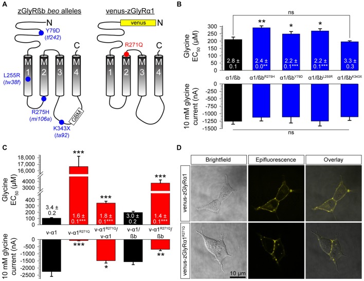 Figure 7. Mutations in zGlyRÃb and zGlyRα1 result in hypomorphic receptors. (A) Location of mutations in zGlyRÃb that give rise to bandoneon (beo) mutants, and analogous position in hGlyRα1 of mutations that cause hyperekplexia. (GBM) Gephyrin-binding motif. (B) Cumulative effects of bandoneon mutations on heteromeric receptorsâ EC50 for glycine and average 10 mM glycine-evoked currents. Of note, oocytes were injected with 1 femtomole of zGlyRα1 cRNA and four femtomoles of zGlyRÃb cRNAs. Ten oocytes were used for each assay. Numbers inside bar here and in (C) represent Hill coefficient, and *p < 0.05, **p < 0.01, and ***p < 0.001. (C) Effect of dominant-negative R271Q mutation on both homomeric and heteromeric receptorsâ EC50 for glycine and average 10 mM glycine-evoked currents. Each oocyte was injected with 2.5 femtomoles of venus-tagged zGlyRα1 cRNAs and 2.5 femtomoles of zGlyRÃb cRNA. Ten oocytes were used for each assay. (D) Confocal images of HEK293T cells expressing venus-tagged zGlyRα1 subunits.