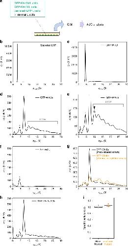 Fig. 1. Analytical ultracentrifugation analyses of GFP-tagged Wnt3a proteins secreted from cultured cells. a Schematic representation of the analysis using AUC. bâf AUC-FDS analysis of secreted GFP (nâ=â3; (b)), GFP-tagged Drosophila WntD (GFP-WntD; nâ=â7; (c)), and GFP-tagged mouse Wnt3a (GFP-Wnt3a; nâ=â20; (d, e)), secreted from stably transformed mouse L cells. As a negative control, AUC-FDS analysis of conditioned medium (C.M.) from neomycin-resistant L cells is also indicated (nâ=â4; (f)); e is an enlarged version of d. HMW indicates high-molecular-weight complex. The closed arrowhead in e indicates the HMW complex with the smallest molecular mass (~9.6âS corresponding to ~200âkDa). g AUC-FDS analysis of GFP-Wnt3a in culture media with mock-treated (black; nâ=â3) or afamin pre-depleted (orange; nâ=â3) serum. The relative area size of the Wnt3a/afamin complex peak, which was normalized by the whole area size obtained in each measurement, was significantly decreased by afamin pre-depletion (relative area of ~ 7.0 peaks was decreased from 35.1â±â6.6% to 14.1â±â1.5% by the pre-depletion (meanâ±âs.d., pâ<â0.05); whereas that of the HMW peaks was increased from 51.1â±â4.8% to 69.6â±â1.2% (meanâ±âs.d., pâ<â0.05, nâ=â3, paired t-test). h AUC-FDS analysis of GFP-Wnt3a secreted from HEK293 cells (nâ=â4). i Wnt signaling activity of GFP-Wnt3a in culture media with mock-treated (black) or afamin pre-depleted (orange) serum. Wnt activity monitored by use of the SuperTOPFlash assay was normalized by the fluorescence intensity of GFP. Peaks marked with asterisks in dâh appeared to be derived from fluorescent molecules bound to serum albumin, such as bilirubin (Supplementary Fig. 3f) |