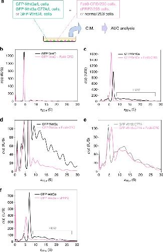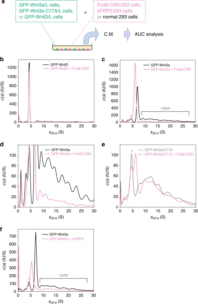 Fig. 2. Analytical ultracentrifugation analyses of GFP-tagged Wnt proteins with Fzd8 CRD or sFRP2. a Schematic representation of the analysis. b, c AUC-FDS analysis of conditioned medium of L cells secreting GFP-WntD (nâ=â7; (b)) and GFP-Wnt3a (nâ=â8; (c)) co-cultured with HEK293 cells secreting the CRD domain of mouse Fzd8 (pink line) or with control HEK293 cells (black line). For comparison with (e) below, an enlargement of (c) is also shown as (d). e AUC-FDS analysis of conditioned medium of L cells secreting GFP-Wnt3a carrying the C77A mutation cultured with HEK293 cells secreting the CRD domain of mouse Fzd8 (pink line; nâ=â3) or control HEK293 (gray line; nâ=â3). A peak with molecular mass corresponding to the Wnt/Fzd8-CRD complex was detected, but its area was smaller comapred with the case of wild-type Wnt3a. f AUC-FDS analysis of conditioned medium of L cells secreting GFP-Wnt3a cultured with HEK293 cells secreting mouse sFRP2 (pink line; nâ=â8) or control HEK293 cells (black line; nâ=â8). HMW indicates high-molecular-weight complex. Peaks marked with asterisks in câf appeared to be derived from fluorescent molecules bound to serum albumin, such as bilirubin |
