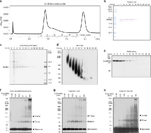 Fig. 3. Characterization of Wnt3a fractionated by gel filtration. a Elution profile of gel filtration column chromatography. Affinity-purified FLAG-Wnt3a proteins, prepared from serum-free medium conditioned with FLAG-Wnt3a-secreting L cells, were subjected to gel filtration column chromatography (Superdex200 PC3.2/30, GE Healthcare). b Analysis of fractionated proteins by western blotting with anti-FLAG antibody. Wnt3a proteins are recovered in widely spread fractions, including a fraction corresponded to the void volume (fraction #4). c Analysis of fractionated proteins by silver staining. Protein whose size corresponded to FLAG-Wnt3a is the major component in fractions from fraction #2 to #16. d Analysis of fractionated proteins by western blotting using Blue Native PAGE (Invitrogen), which can separate high-molecular-weight proteins while maintaining their native conformation. This analysis shows that the size of Wnt-3a protein complex is mostly distributed between ~150âkDa and 1000âkDa. Of note, a discrete band corresponding to 150âkDa is detected in fraction 14. An arrow indicates a discrete band whose molecular weight corresponded to the size of a Wnt trimer. e Wnt signaling activity assessed by application of each fraction to mouse L cells. Since the β-catenin protein level is quite low in the absence of Wnt signaling in L cells, we directly monitored Wnt signaling activity by measuring the β-catenin protein level in these L cells. All of the fractions in which FLAG-Wnt3a was detectable increased the β-catenin level, indicating that Wnt3a protein still possessed its signaling activity. fâh Cross-linking analysis with proteins in unfractionated pool (f), in void volume (g), and in fraction 14 (h). Full blot images of bâh are shown in Supplementary Fig. 9 |
