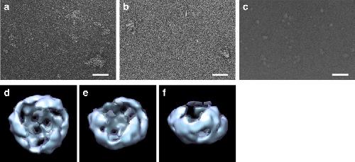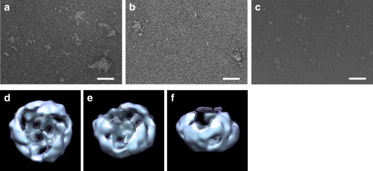 Fig. 4. Electron microscopic images of fractionated Wnt3a. aâc EM images of unfractionated sample (a), sample eluted in void volume (b), and sample recovered in fraction 14 (c). The scale bar in aâc represents 500âà . dâf Image of Wnt3a reconstructed by single-particle analysis. Top view (d), oblique view (e), and side view (f) are shown. The volume enclosed by the isosurface is 100% (cyan) and 150% (dark blue) of the volume estimated from the molecular weight of the Wnt3a trimer |