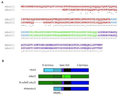 A) Protein sequence alignment of mAscl1 and xAscl1 using ClustalW software. N terminus shown in red; basic domain in blue; HLH domain in green; C terminus in purple. A consensus line is shown below the alignment to indicate the degree of conservation of amino acids at each position: (*) denotes identical residues; (:) denotes highly conserved residues; (.) denotes weakly conserved residues. (