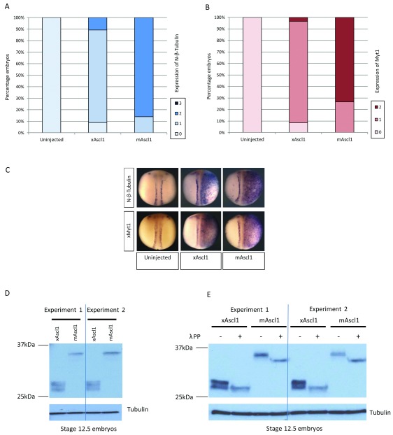 C) Two cell stage embryos were unilaterally injected with 100pg of mRNA encoding either xAscl1 or mAscl1. At stage 18, embryos were assayed by