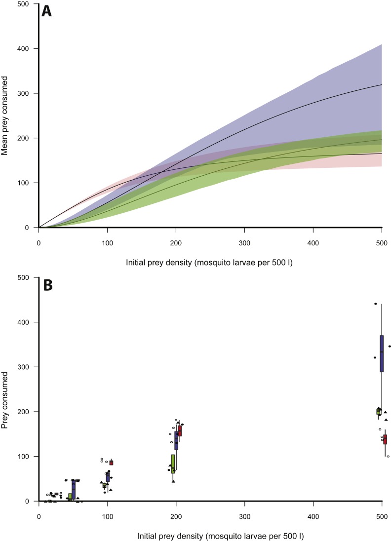 Figure 1. Functional responses of X. laevis preying on mosquito larvae.(A) Functional responses of individual small (red), medium (blue) and large (green) size classes of X. leavis in different initial densities of mosquito larvae (per 500 l). Solid lines represent model curve and shaded areas represent 95% confidence intervals calculated by non-parametric bootstrapping. (B) Box plots and data points for each trial with small (red, open circles), medium (blue, closed circles) and large (green, closed triangles) size classes of X. leavis.