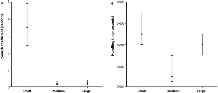 Figure 2. Search coefficient and handling time from functional response models.(A) Search coefficient (in seconds) and (B) handling time (in seconds) parameters derived from flexible functional response models for small, medium and large size classes of X. laevis. Points are original model values and error bars are bootstrapped 95% Confidence Intervals.
