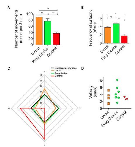 Figure 5. Locomotor Activity in Prog-Device Treated Animals Resembles More Closely that of Uncut Animals (A) Quantifications of efficient activity levels, measured by counting the number of active movements (with trajectory displacement). Values are represented as mean ± SD (n = 4 animals per group). One-way ANOVA p < 0.01. p values after Bonferroni’s post hoc analysis are indicated as *p < 0.05, **p < 0.01, ns, p > 0.05. (B) Surfacing frequency or number of visits to the water-air surface performed by each experimental group per time unit (minute). Values are represented as mean ± SD (n = 4 animals per group). One-way ANOVA p < 0.01. p values after Bonferroni’s post hoc analysis are indicated as *p < 0.05, **p < 0.01, ns, p > 0.05. (C) Graphic representation of the percentage of time spent in each quadrant of the tank per experimental group. Unbiased exploration (black line) is shown as reference (25% of time in each quadrant). Analysis of the time distributions within each experimental group showed clear significant differences (p < 0.01 for c2 (0.05,9)). Data represent the pooled distribution of animals per group (see Figure S6A for contingency graph). (D) Mean speed (expressed in centimeters per second) at which each animal (represented by individual dots) swims around the tank. Orange squares, uncut or intact animals; green circles, amputated animals followed by Prog-device combined treatment; red triangles, amputated animals without additional treatment. |