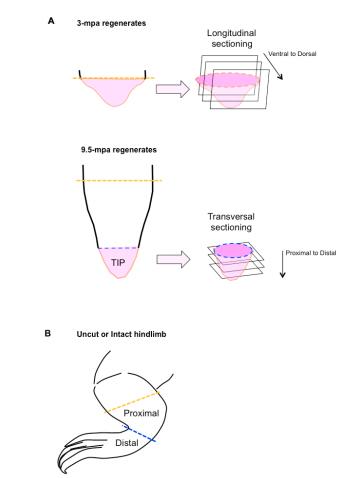Supplementary Fig. S5. Experimental design and section axis for histological processing of the regenerates (A) and the uncut or intact frog hindlimb B), Related to Figure 1 & Figure 4 A. Top, Drawing represent a short-term regenerate, indicating plane for tissue harvesting (orangedashed line indicates the original amputation site) and longitudinal sectioning, following the ventral-to-dorsal axis. Bottom, The most distal portion of the 9.5-mpa regenerates (or tips) were recut approximately 2 cm below the original amputation plane (dashed-blue line indicates plane for recutting and orange-dashed line indicates the original amputation plane). Tips were sectioned along the transversal plane, obtaining cross sections (dashed-blue line) for histological analysis. B. Tips of 9.5-mpa regenerates were morphologically compared to the uncut or intact limb. Two different levels of the uncut limb were separately cross-sectioned, immunostained and analyzed: proximal or distal respect to the regular level for the amputation plane (orange-dashed line). |