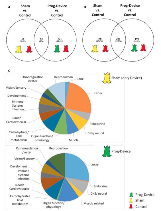 Figure 6. Subnetwork Enrichment Analysis of All Three (Ctrl, Sham, and Prog-Device) Blastema Datasets Showing Quantitatively and Qualitatively Differences for Regulated Transcripts and Cell Processes after Combined Prog-Device Treatment (A and B) Venn diagram comparing genes (A) and subnetworks (B) regulated in blastema for both Sham and Prog-device interventions. (C) Pie chart of the functional classification of the pathways exclusively regulated after Sham intervention (top, amputation followed by only hydrogel device) or after the combined Prog-device treatment (bottom, amputation followed by hydrogel device + drug). |