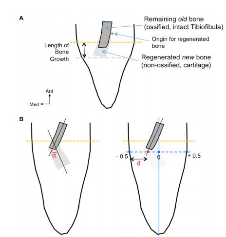 Supplementary Fig. S3. Assessment of the bone growth and its reintegration with the remaining tissues, Related to STAR Methods and Figure 2C. A. Diagram of a prototypical 2-mpa regenerate, under X-ray image, showing the biological meaningful elements and morphometric parameters used to evaluate the skeletal outcome over time: maximal length of bone from the amputation plane (BLEN; Table 1) and maximal area occupied by new bone growth (mostly non-ossified bone or regenerated cartilage, BAREA; Table 1). Responsive animals generated the same bone growth pattern as displayed in the graphic. The skeletal regrowth origin began above the plane of amputation, indicating the occurrence of a secondary or spontaneous amputation (as described in mice by Muneoka’s group (Fernando et al., 2011)). The secondary amputation acts as a catalyst for bone regeneration as it creates more bone resorption and degradation. The newly formed bone typically widened at its distal end and deviated from the midline of the intact tibiofibula. The morphometric analysis was performed on regenerates belonging each experimental group (Control and Prog-device, respectively) at five selected times for a 9.5-month period: 0.5, 1, 2.5, 5, 7.5 and 9.5 months post amputation (mpa). Representative images and graphs are indicated in Fig. 3 and Supplementary Fig. S4. B. Diagram of a prototypical 7.5-mpa regenerate, under X-ray image, including the axis used to evaluate the reintegration of the regenerated bone and remaining tissues during limb regeneration. Left, Reintegration of the regenerated new bone and the remaining old bone. We evaluated the deviation angle (α) formed under the intersection between the middle line of the new bone growth and the middle line of the remaining bone (longitudinal axis of the tibiofibula). Right, The geometric intersection between the middle line of the intact tibiofibula bone and the plane set by the base of the regenerate was taken for evaluating the old-bone displacement (d) over the course of the 6 regeneration, from the longitudinal axis to the medial edge of the soft tissue. This morphometric analysis was performed on regenerates belonging each experimental group (Control and Prog-device, respectively). Representative images and graphs are indicated in Fig. 2C-2E. |