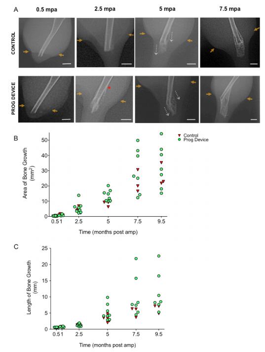 Supplementary Fig. S4. Bone patterning as seen under X-ray images over a 9.5-month regenerative period, Related to Figure 2. A. The morphometric analysis was performed on regenerates belonging each experimental group, Control (top) and Prog-device (bottom), at five selected times for a 9.5-month period: 0.5, 1, 2.5, 5, 7.5 and 9.5 months post amputation (mpa). The lateral brown arrows indicate amputation plane. As soon as 2.5 mpa, new bone growth above the amputation plane (red asterisk) is detected in treated animals, suggesting that the necessary catalyst for bone regeneration (as it creates more bone resorption and degradation) is enhanced by treatment. B, C. Overall, treated animals show a tendency for bigger area (B) and longer (C) new bone growth. As might be expected with the variability of genetic background, individual animals are clearly observed to be strong treatment ‘Responders’, while other treated animals behaved as ‘Non-responders’, similar to individuals in Control group. See Supplementary Fig. S2 for details and meaning of the 8 measurements. Scale bar = 0.5 cm. Values are represented with scatter plots, where each dot represents one animal. |