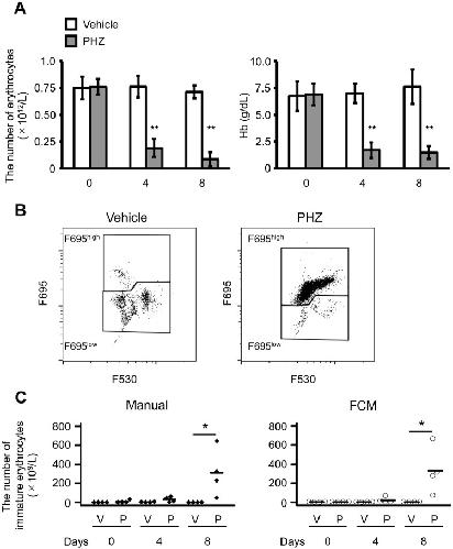 Figure 7. Analysis of peripheral blood derived from anaemic X. laevis. (A) Erythrocyte counts (left panel) and haemoglobin (Hb) concentration (right panel) in peripheral blood after the administration of phenylhydrazine (PHZ; 25âmg/kg body weight, intraperitoneally, day 0). All values are shown as the meanâ±âSD. **pâ<â0.01 vs control (nâ=â4). (B) The LP3 fraction was analysed to determine the F530 and F695 fluorescence intensity. The F695high population of the LP3 fraction was markedly increased after PHZ administration. (C) Comparison of immature erythrocyte counts between the manual method (left panel) and flow cytometry (right panel). *pâ<â0.05 vs. control (nâ=â4). |
