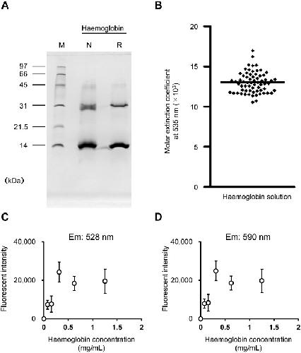 Figure 1. The molar extinction coefficient of sodium lauryl sulphate-haemoglobin (SLS-Hb). (A) X. laevis haemoglobin was purified, and SDS-PAGE was performed. Monomeric (14 kDa) and dimeric (30 kDa) Hbs were detected. M: Molecular marker; N: Non-reduction condition; R: Reduction condition. (B) The absorbance at 535 nm of SLS-Hb was measured and the molar extinction coefficient was calculated. Bar indicates the mean of the extinction coefficient (n = 66). (C,D) The fluorescence of purified haemoglobin was measured. (C) Excitation 485/20 nm, emission 528/20 nm. (D) Excitation 485/20 nm, emission 590/35 nm. |
