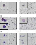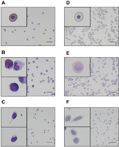 Figure 3. Morphology of LP2, LP3, and LP4 cells. Erythrocytes and leukocytes/thrombocytes separated from whole blood cells using the Percoll method were analysed and sorted. May-Grunwald Giemsa (MGG) and periodic acid-Schiff (PAS) staining were performed on the LP2, LP3, and LP4 fractions. (AâC) MGG staining. (A) LP2, (B) LP3, and (C) LP4. LP2 cells were mononuclear with a large cytoplasm. LP2 cells had eosinophilic cytoplasm. LP3 had segmented nuclei and a large cytoplasm. Cells with a basophilic cytoplasm were found in the LP3 fraction. LP4 cells were mononuclear with a small cytoplasm. (DâF) PAS staining. (D) LP2, (E) LP3, and (F) LP4. The LP2 and LP4 cells were negative for PAS staining, and LP3 cells were positive for PAS staining. Scale bars: 20âµm. LP2: erythrocyte; LP3: granulocyte; LP4: lymphocyte and thrombocyte (inset). |