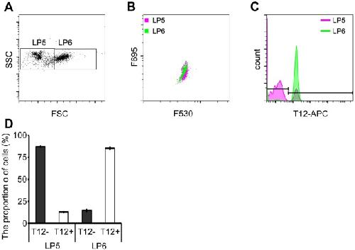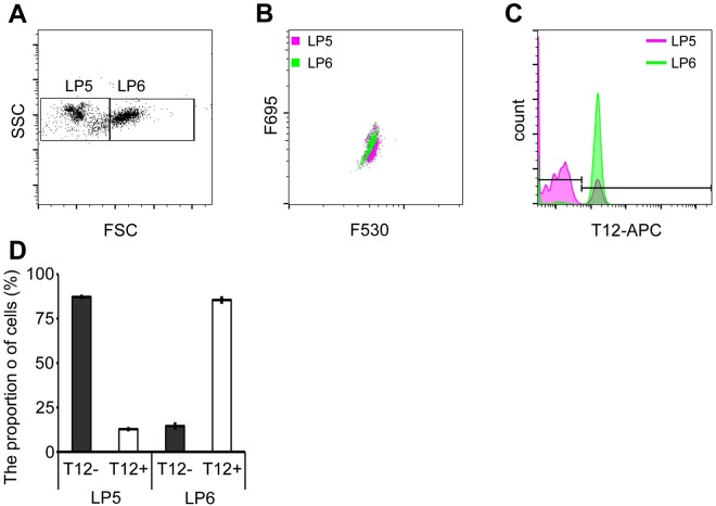 Figure 4. Separation of thrombocytes from the LP4 fraction. (A) The LP4 fraction was analysed using forward-scattered light (FSC) and side-scattered light (SSC), and categorized as LP5 and LP6. The FSC of LP6 was higher than that of LP5. (B) LP5 and LP6 were analysed using F530 and F695 fluorescence intensity. LP5 and LP6 overlapped. (C,D) LP5 and LP6 cells were immunostained with the T12 antibody and analysed by flow cytometry (FCM). T12-positive cells were mostly found in the LP6 fraction, although the LP5 fraction had T12-positive cells (approx. 10%). |