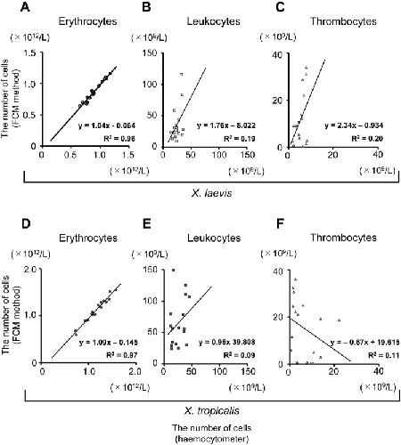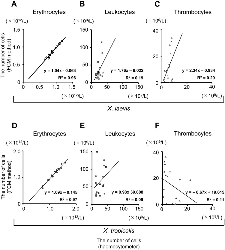 Figure 6. Comparison of haematological parameters between acridine orange (AO) staining and haemocytometer results. (A–C) Correlation between AO-staining and haemocytometer results in X. laevis. The number of (A) erythrocytes, (B) leucocytes, and (C) thrombocytes was identified. The number of leukocytes was determined using FCM, according to the sum of the number of granulocytes and lymphocytes. (D–F) Correlation between AO-staining and haemocytometer results in X. tropicalis. The number of (D) erythrocytes, (E) leucocytes, and (F) thrombocytes was determined. |