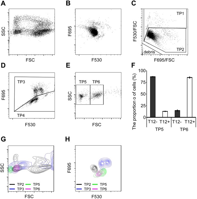 Figure 5. Scattergram analysis of peripheral blood (PB) from X. tropicalis. (A) Scattergram indicates FSC and SSC. (B) Scattergram indicates the F530 and F695 fluorescence intensity. (C) Blood cells were analysed for their cellular F695/FSC and F530/FSC intensities. The F530/FSC high and low populations were categorised as TP1 and TP2, respectively. (D) Based on F695 fluorescence intensity the TP1 fraction was separated into the TP3 (high intensity) and TP4 (low intensity) fractions. (E) Using FSC and SSC, the TP4 fraction was separated into TP5 (low FSC) and TP6 (high FSC). (F) TP5 and TP6 cells were immunostained with the T12 antibody and analysed by FCM. T12-positive cells were mostly found in the TP5 fraction, although the TP6 fraction had some T12-positive cells (approximately 10%). (G) TP2, TP3, TP5, and TP6 were developed using FSC and SSC. (H) TP2, TP3, TP5, and TP6 were analysed based on the F530 and F695 fluorescence intensity. TP2: Erythrocytes (grey); TP3: Granulocytes (Red); TP5: Lymphocytes (green); TP6: Thrombocytes (purple). |