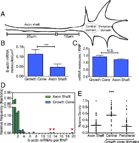 Fig. 4. smFISH reveals that the localization patterns of β-actin mRNA vary according to axonal subcompartment. (A) Cartoon representation of the different axonal regions analyzed. (B) A comparison of the density of β-actin mRNA molecules in the growth cone and axon shaft via smFISH shows significantly increased density of β-actin mRNA in the growth cone. (C) No difference between β-actin mRNA RNP stoichiometry was observed in the different subcompartments. N.S. not significant. (D) Histogram of β-actin mRNA stoichiometry. Arrowheads indicate more highly multiplexed copy numbers in the growth cone. (E) Relative density of β-actin mRNA across subcompartments of the same axon shows significant enrichment in the central domain of the growth cone. ***P < 0.0001; paired Studentâs t test; n = 63 axons. |
