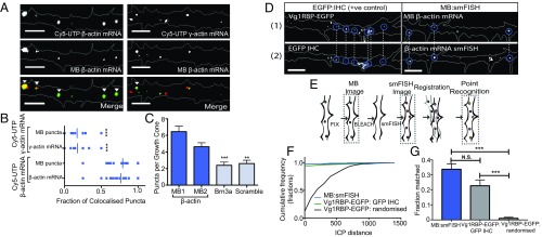 Fig. 2. Molecular beacons label β-actin mRNA in growing axons. (A) MBs colocalize significantly more with exogenous fluorescently tagged β-actin mRNA than with exogenous fluorescently tagged γ-actin mRNA in growing RGC axons. (Scale bars: 5 μm.) (B) Quantification of colocalization between β-actin mRNA-targeting MBs and exogenous Cy5-UTP β-actin mRNA and Cy5-UTP γ-actin mRNA. P < 0.0001, n = 21 axons and 11 axons, respectively. (C) MBs targeting β-actin mRNA showed significantly more puncta per growth cone than control MBs targeting Brn3a mRNA or a scrambled sequence. **P = 0.0043, ***P = 0.001, unpaired t test. n = 64, 73, 82, and 86 axons for β-actin MB1, β-actin MB2, Brn3a, and the scrambled sequence, respectively. (D) MBs and smFISH puncta could be observed to mark the same place in nonsimultaneous images, similar to EGFP puncta and IHC against EGFP. (Scale bars: 5 μm.) (E) Schematic showing the workflow for the registration of nonsimultaneous images used to quantify colocalization. (F) Cumulative frequency distribution of ICP distance between matched puncta in MB and smFISH images (n = 14 axons) and in Vg1RBP-EGFP and IHC positive and randomized negative controls (n = 11 axons). (G) Quantification of colocalization based on an ICP distance threshold of 1. ***P < 0.0001, unpaired t test; N.S., not significant. |